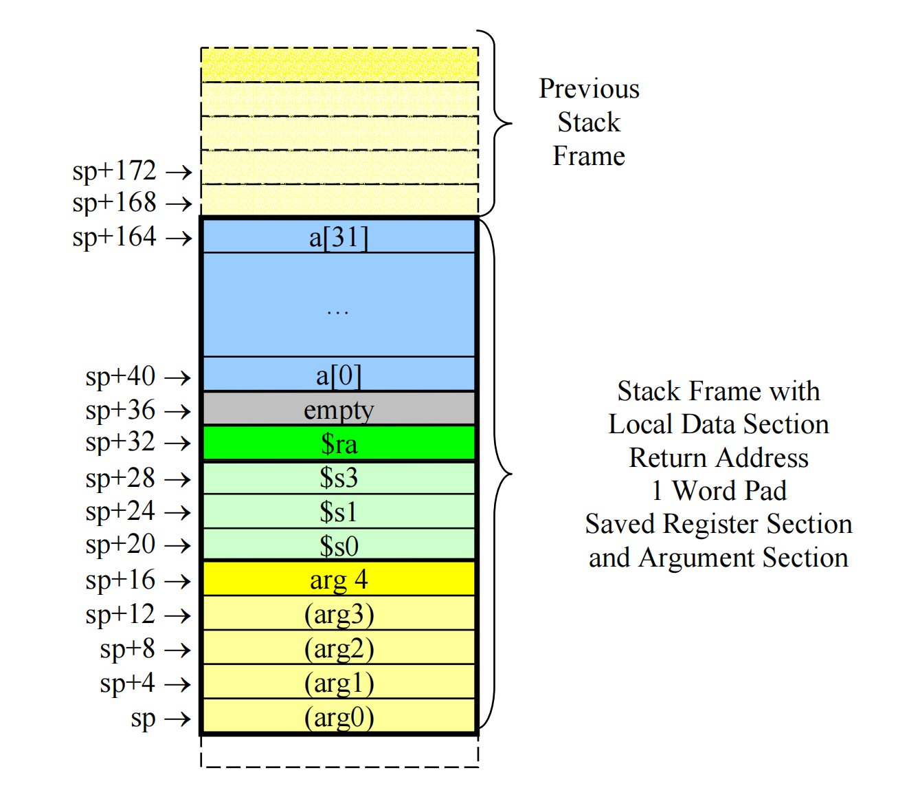 黄色区域,当第一次调用f时,存储参数,无论用不用寄存器传递,都要在栈帧中存。只要调用其他函数,黄色区域必有四个word,但这四个word是空的,只是为了后序f中可能用到而预留的。