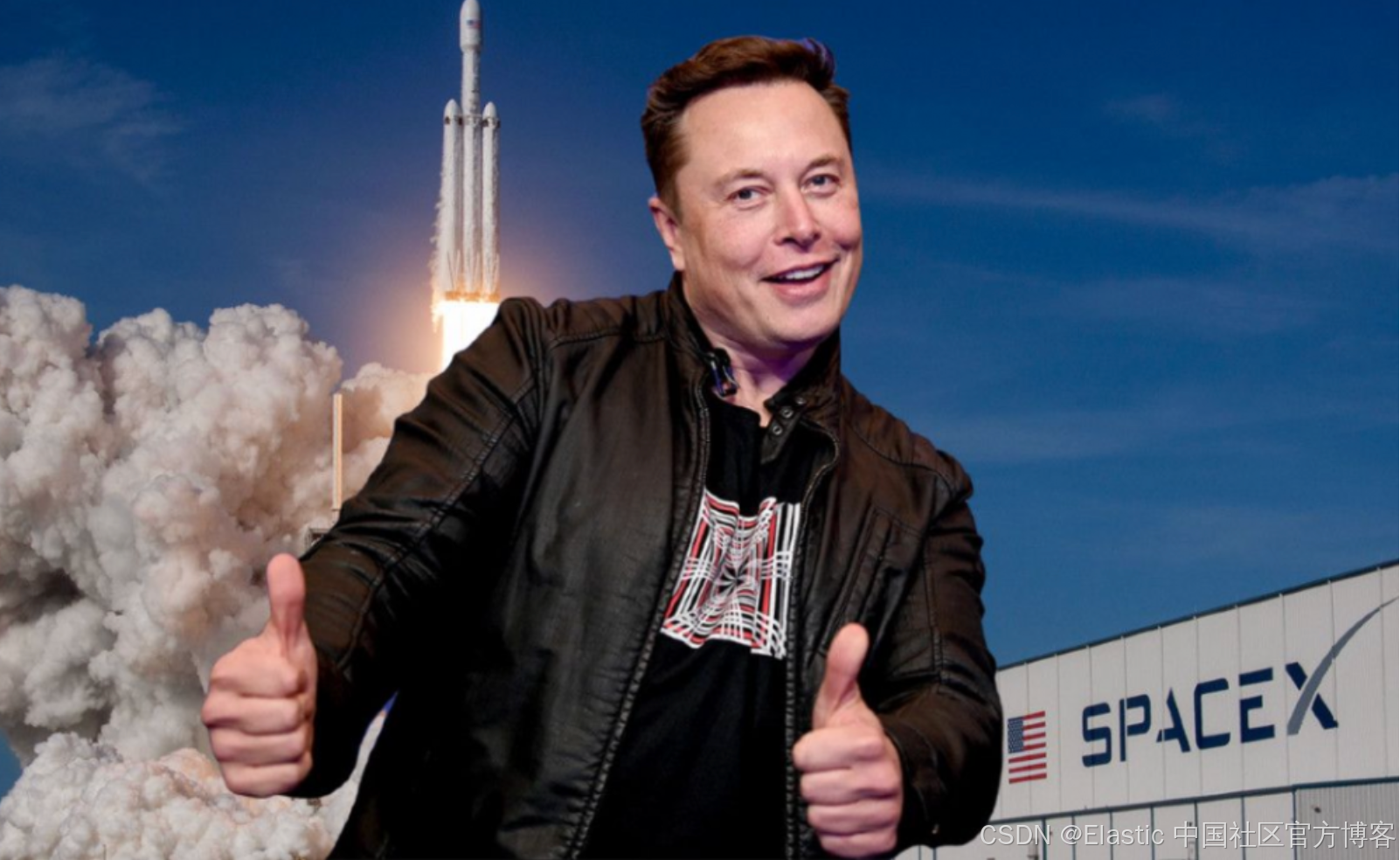 图片中是 Elon Musk(埃隆·马斯克),他竖起大拇指微笑,显得很开心。背景中有一次火箭发射,冒起巨大的烟雾。右侧可以看到 SpaceX 标志,表明这是 SpaceX 的活动现场。整体氛围像是在庆祝一次成功发射或重大成就。