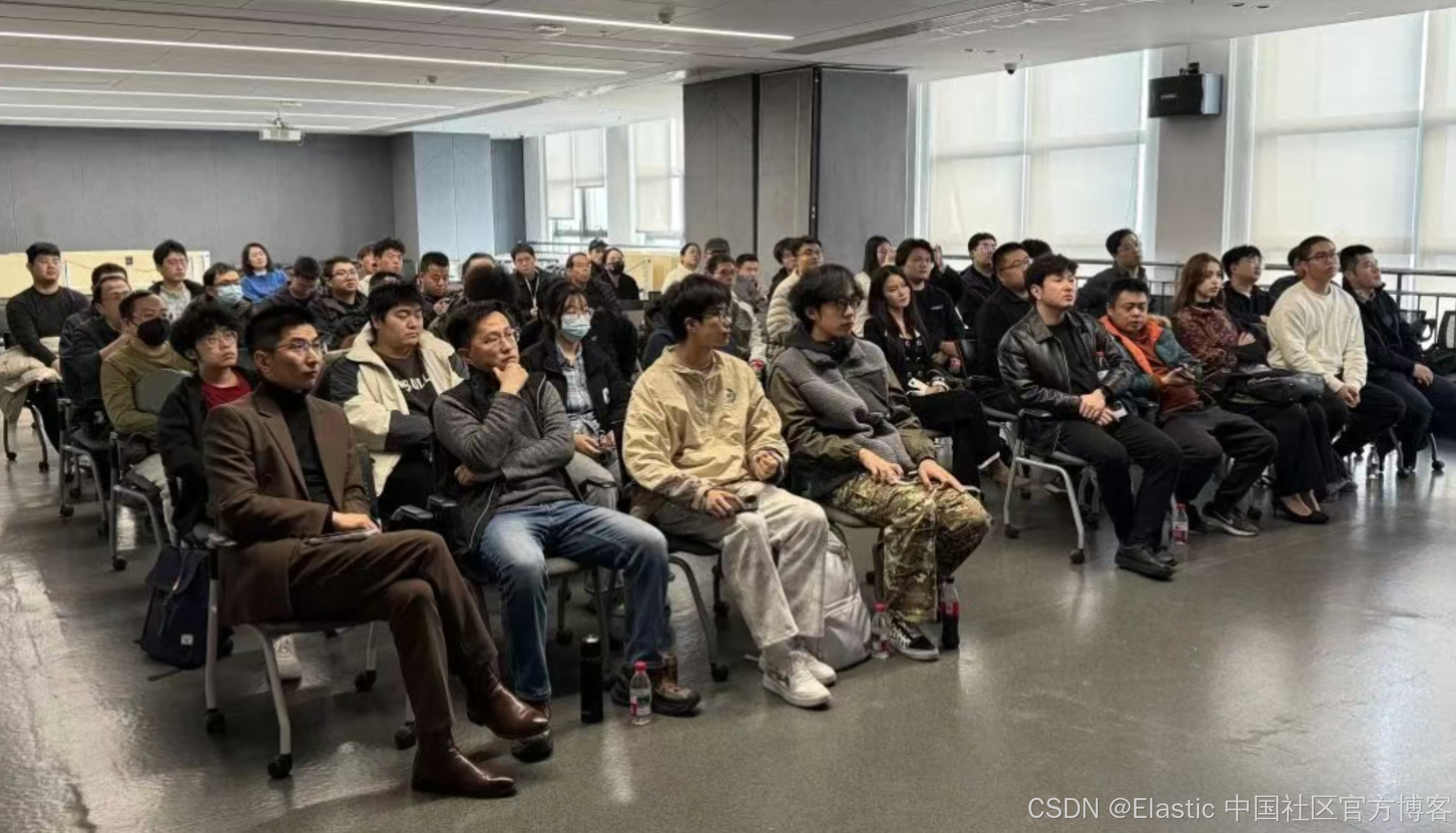 座位排列为多排椅子,椅子为金属材质,设计简洁,排列方式保证观众视线清晰。椅子间距均匀,排与排错开,形成空间深度感。观众由多样化群体组成,主要是年轻成年人,性别混合,着装从休闲到半正式,表明活动不是正式商务会议,而是较轻松的教育或专业聚会。
