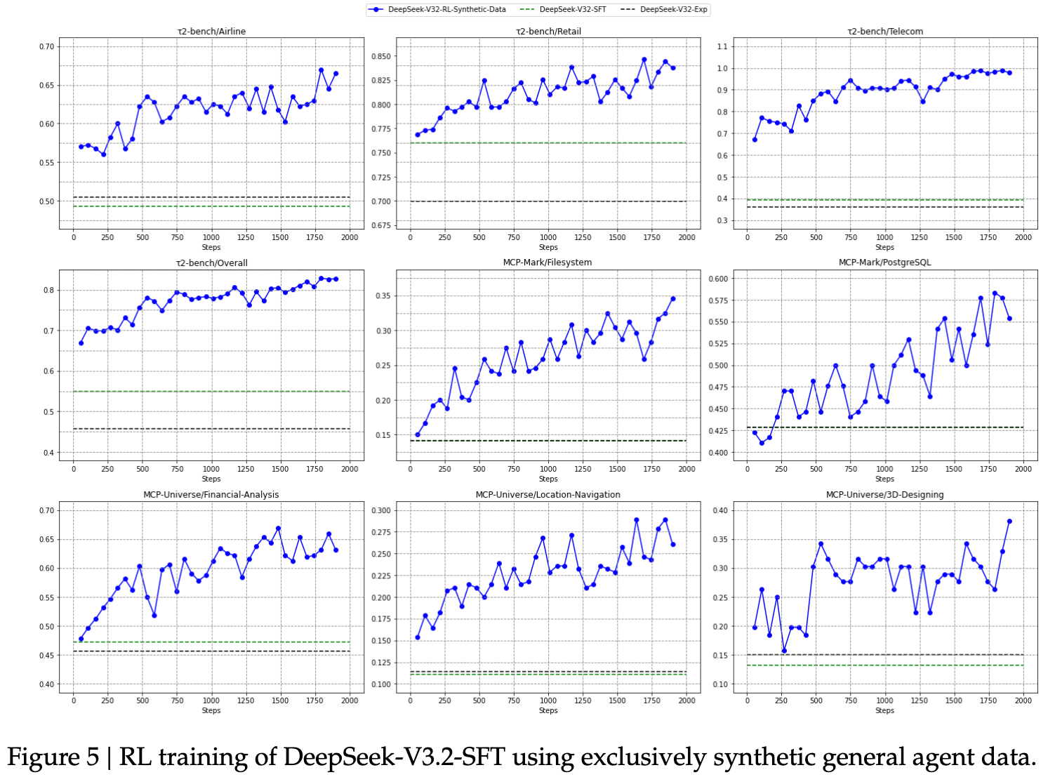 如图 5 所示,大规模的合成数据 RL 在 Tau2Bench、MCP-Mark 和 MCP-Universe 基准上相较 DeepSeek-V3.2-SFT 带来了显著提升。相比之下,将 RL 限制在代码与搜索场景中并不能改善这些基准上的表现,进一步凸显了合成数据的潜力。