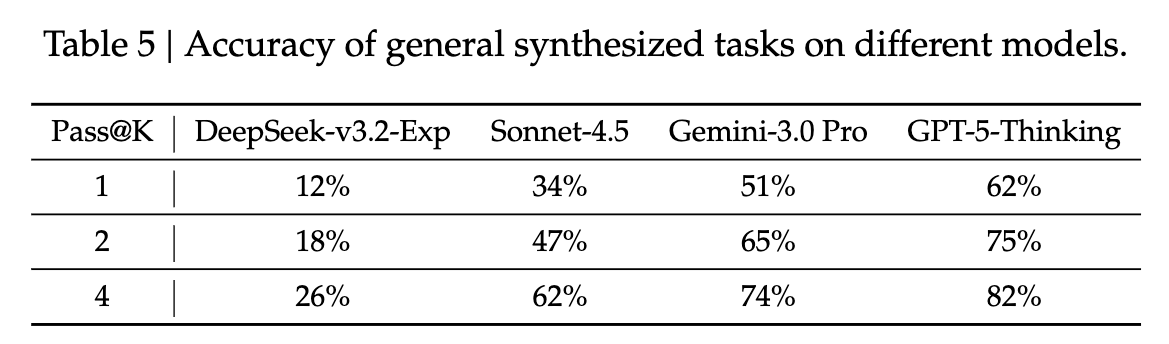 为回答第一个问题,我们从通用的合成智能体任务中随机抽取 50 个实例,分别评估用于生成这些任务的模型以及前沿闭源 LLM。如表 5 所示,DeepSeek-V3.2-Exp 的准确率仅为 12%,而前沿闭源模型的最高准确率也只有 62%。这些结果表明,合成数据中包含的智能体任务对 DeepSeek-V3.2-Exp 和闭源模型而言都具有相当挑战性。