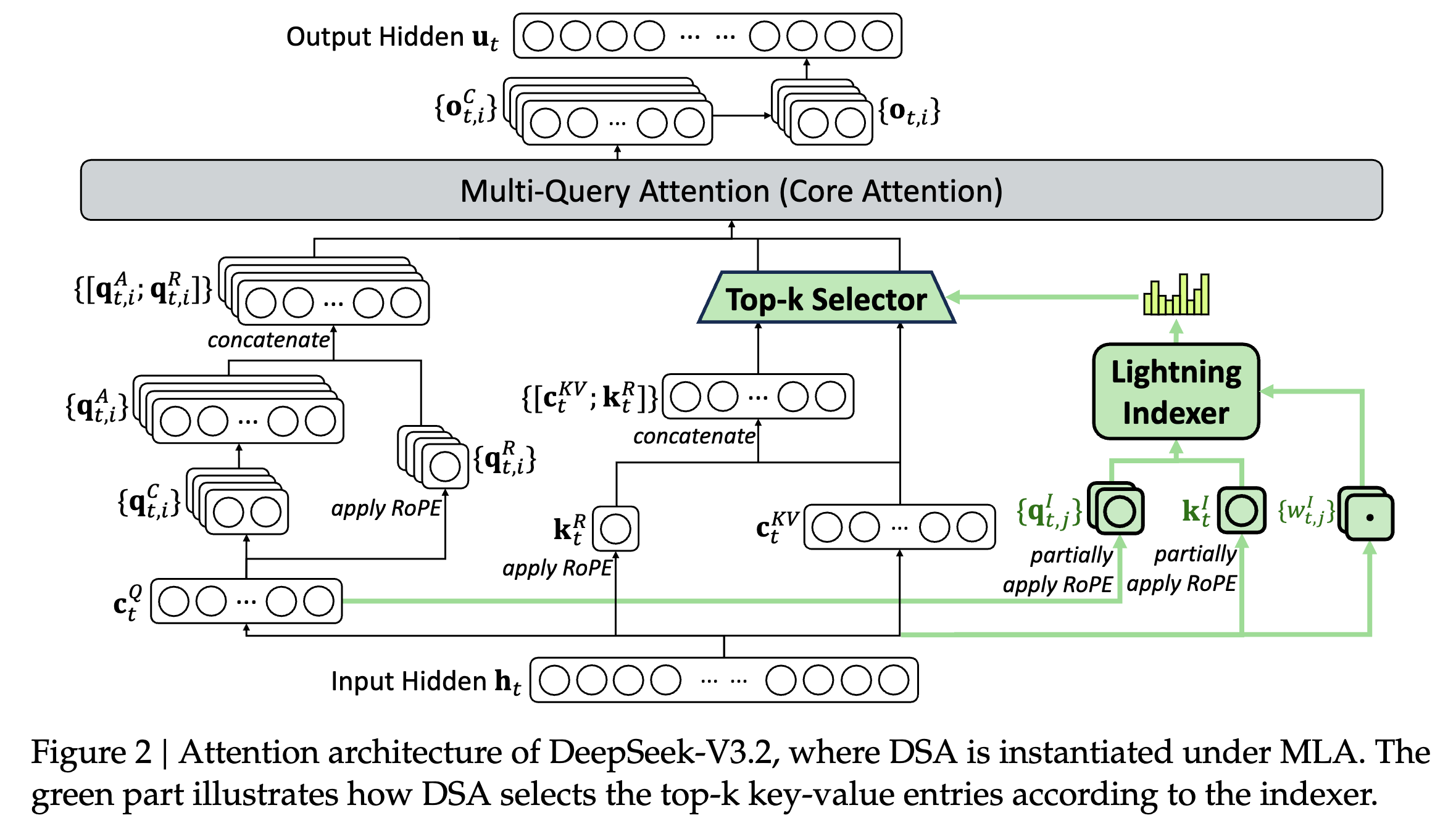 基于 MLA 的 DSA 架构如图 2 所示。我们同时提供了 DeepSeek-V3.2 的开源实现,用于对这些细节做出明确说明。