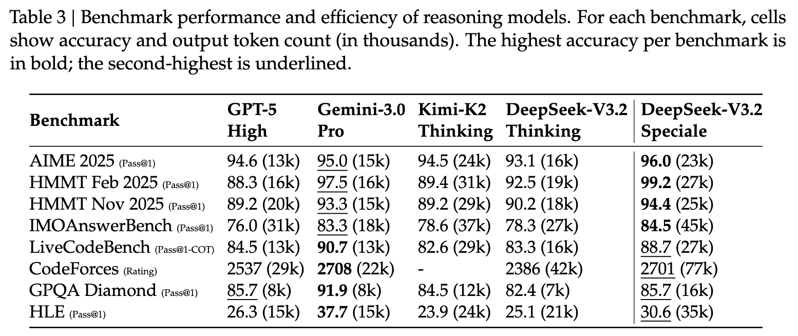 - token 效率仍是一项挑战;DeepSeek-V3.2 往往需要更长的生成轨迹(即更多 token)才能达到类似 Gemini-3.0-Pro 的输出质量
