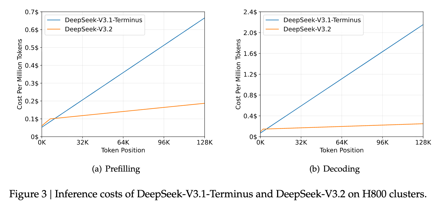 图 3 展示了 DeepSeek-V3.1-Terminus 与 DeepSeek-V3.2 在序列不同位置的 token 成本差异。该成本基于在 H800 GPU (租金为每 GPU 每小时 2 美元)上实际部署服务的基准测试所得。