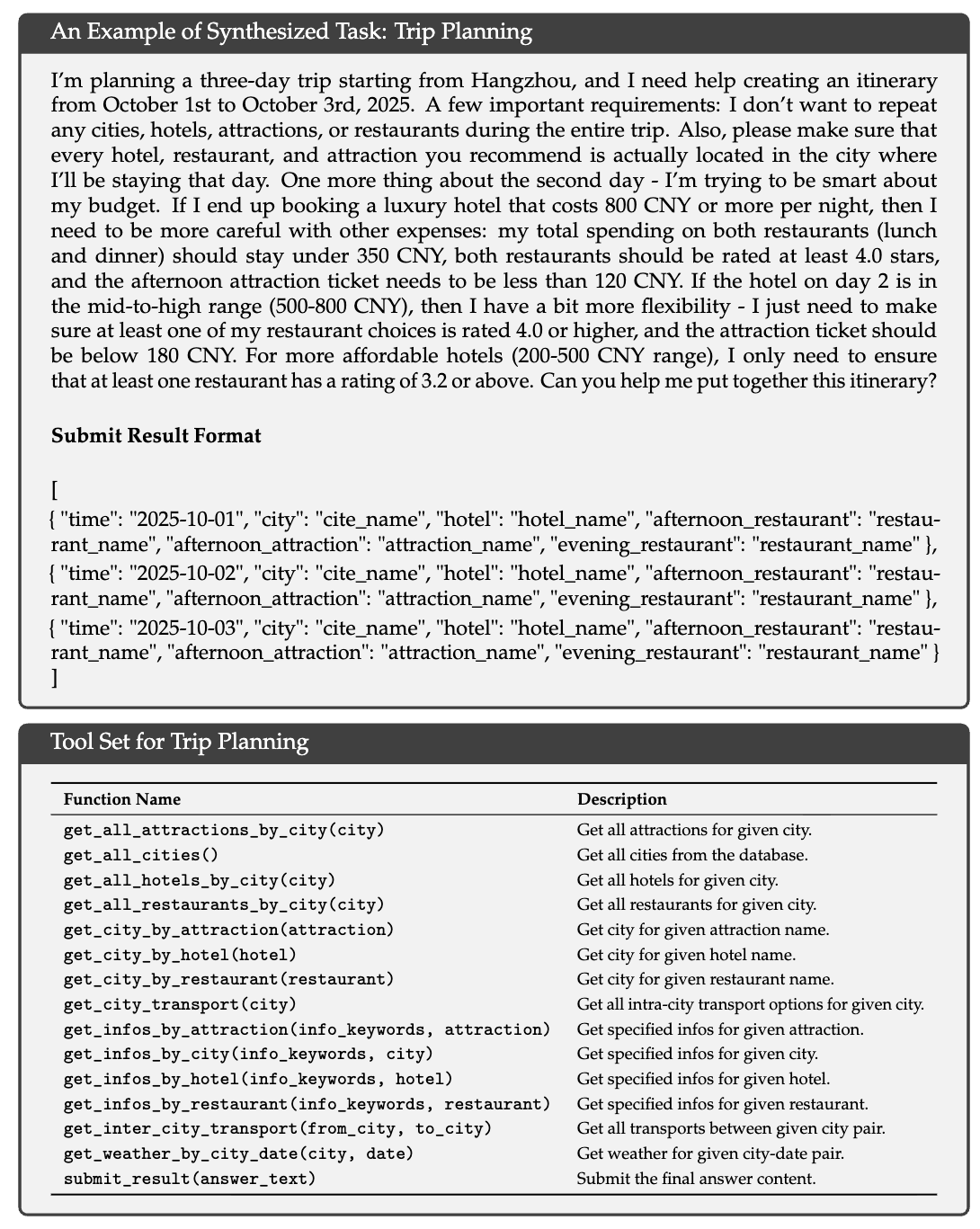 为将推理能力融入工具使用场景,我们开发了一套全新的数据合成流水线,可系统性、规模化地产生训练数据。该方法支持可扩展的智能体后训练,并在复杂、交互式环境中显著提升模型的泛化能力与指令遵循的稳健性。