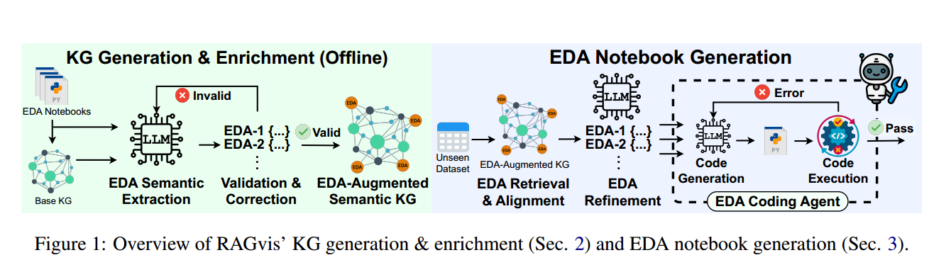 为了解决这些问题,该论文提出了一种 用于生成可执行的EDA代码的RAG框架RAGvis,该框架基于知识图谱,将EDA操作代码与其语义和所使用的数据列联系起来。