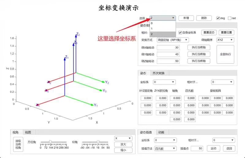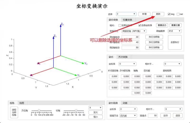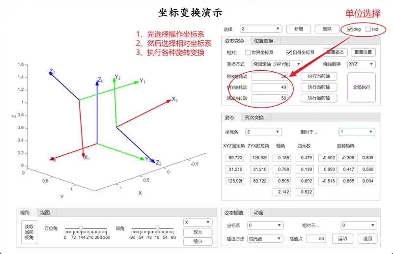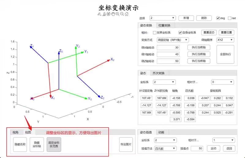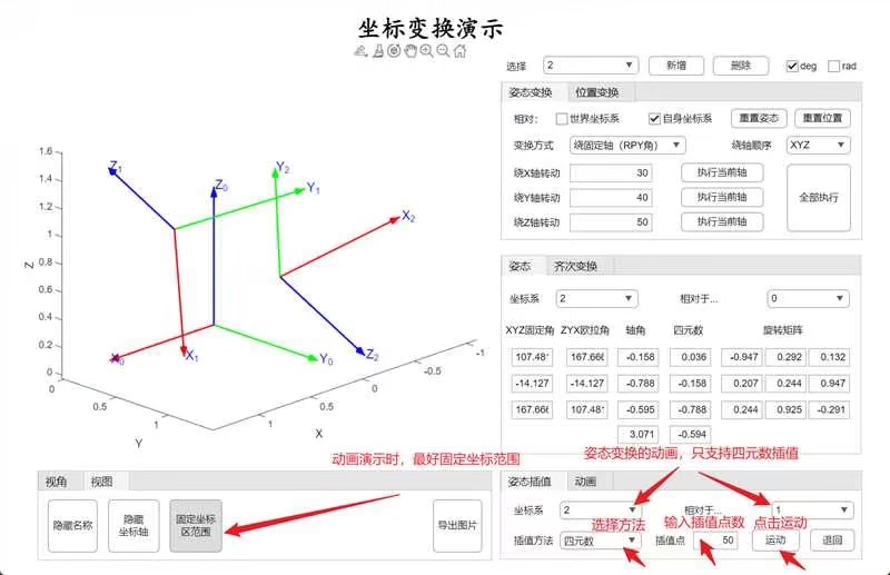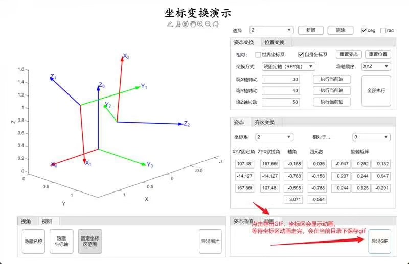 Matlab机器人工具箱,欧拉角RPY角位姿变换。 机器人技术基础,位姿变换演示小基于Matlab开发,可编辑。 p代码版本不可编辑与查看代码,只可使用。 源代码版本可以任意编辑 两个版本的功能完全相同。 带操作使用说明。 涉及机器人学相关的数学知识与matlab编程知识