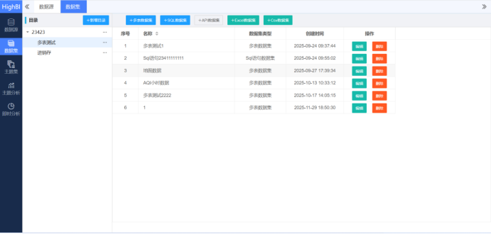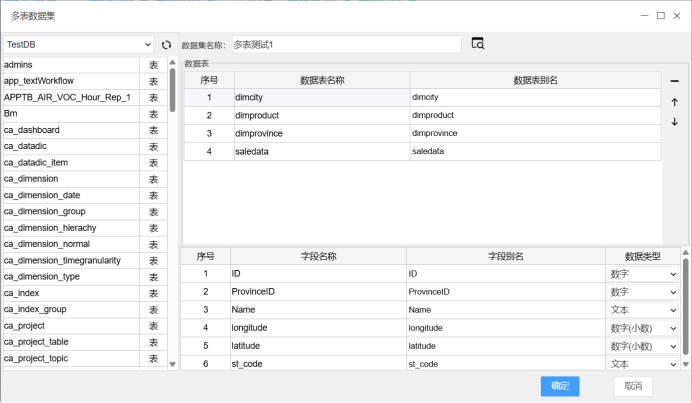 选择需要分析的多张业务数据表,也可以来源于Excel文件或者Csv文件,或者通过Sql语句创建数据集表