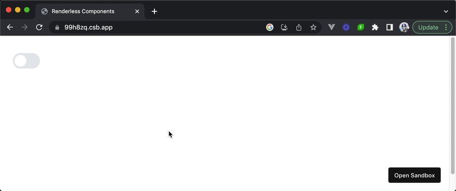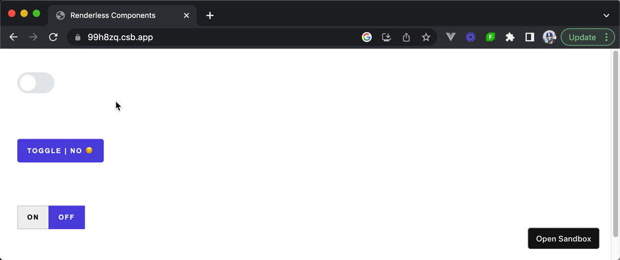在父组件中,我们现在将尝试渲染三个不同的切换元素,每个元素都有自己独特的用户体验。我们首先导入上面创建的无渲染 ToggleComponent 组件。