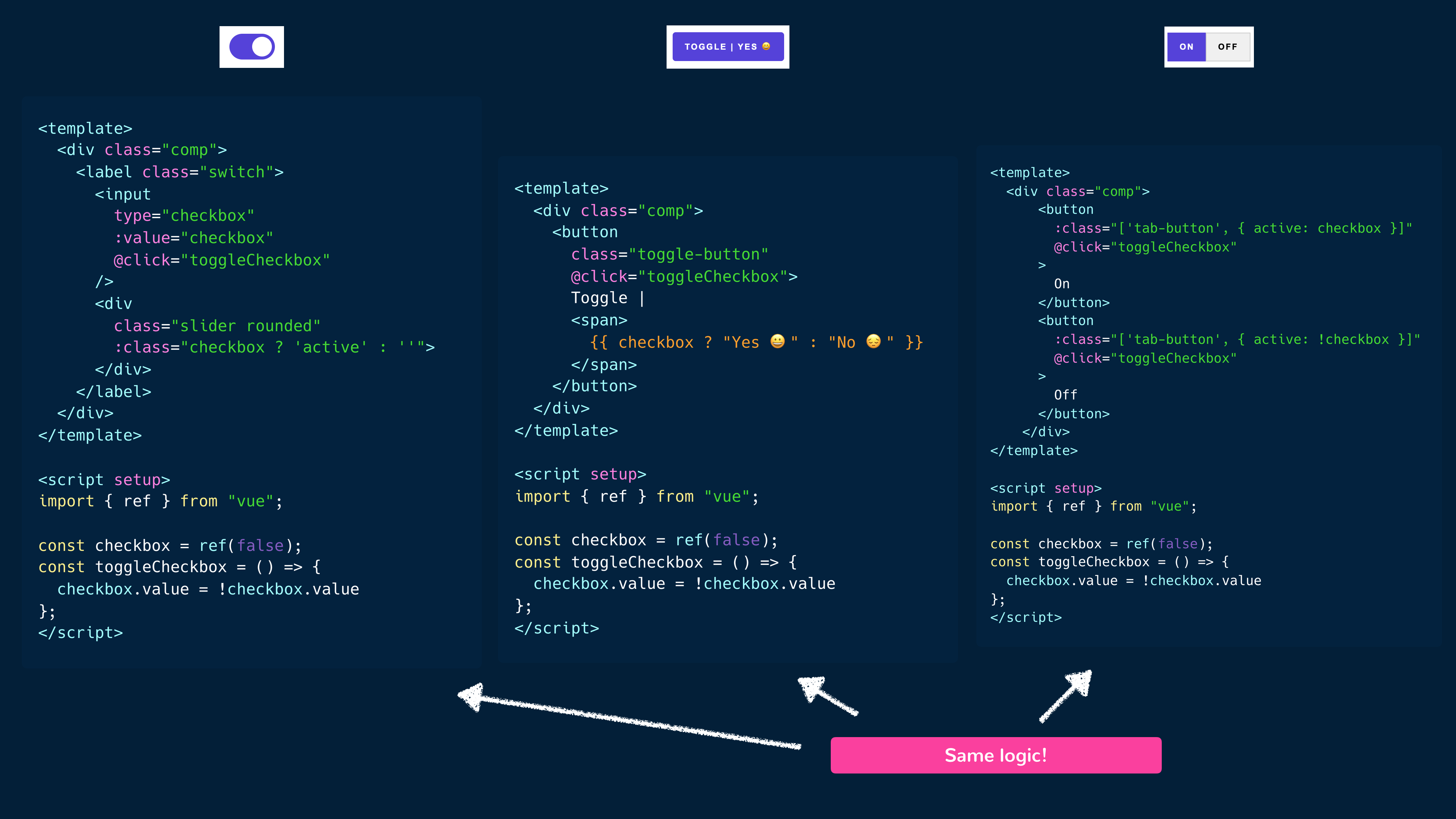 我们可以为上面的示例创建三个不同的切换组件,但是,我们可以观察到每个切换元素具有相同的逻辑和行为。每个切换都有一个非活动状态和活动状态,这些状态通过一个组件数据属性(例如 checked)进行跟踪。当点击一个切换时,它的组件状态从非活动切换到活动,反之亦然(即 checked = !checked)。