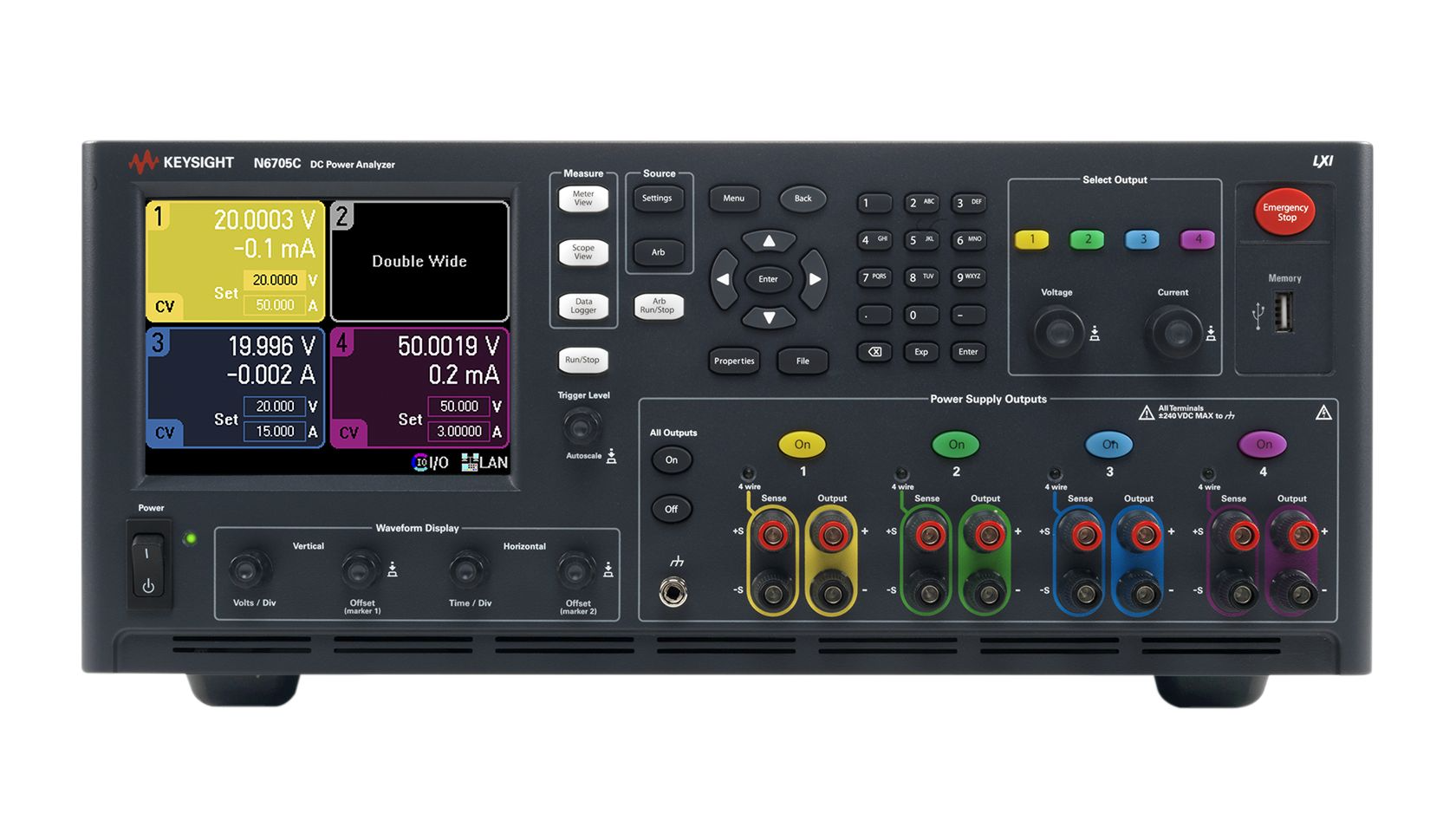 N6705C 直流电源分析仪在前面板上提供了全部功能和测量,因此您无需再开发和调试程序便能控制仪器。 配合使用 Keysight PathWave BenchVue BV9200 控制和分析软件,可以获得更强大的控制和分析功能。