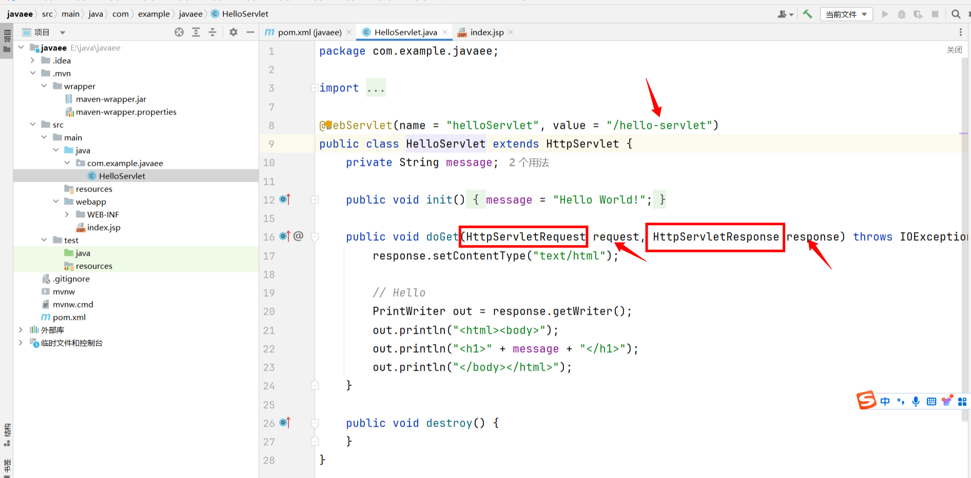 仔细看代码发现有HttpServletRequest和HttpServletResponse,这两个是Servlet API提供的HTTP请求和响应的对象,具体的执行是在底层的服务器应用(也就是我们过会要用的Tomact上执行的),后续关于请求和响应的操作我们在上层用request和response这俩参数就可以了。