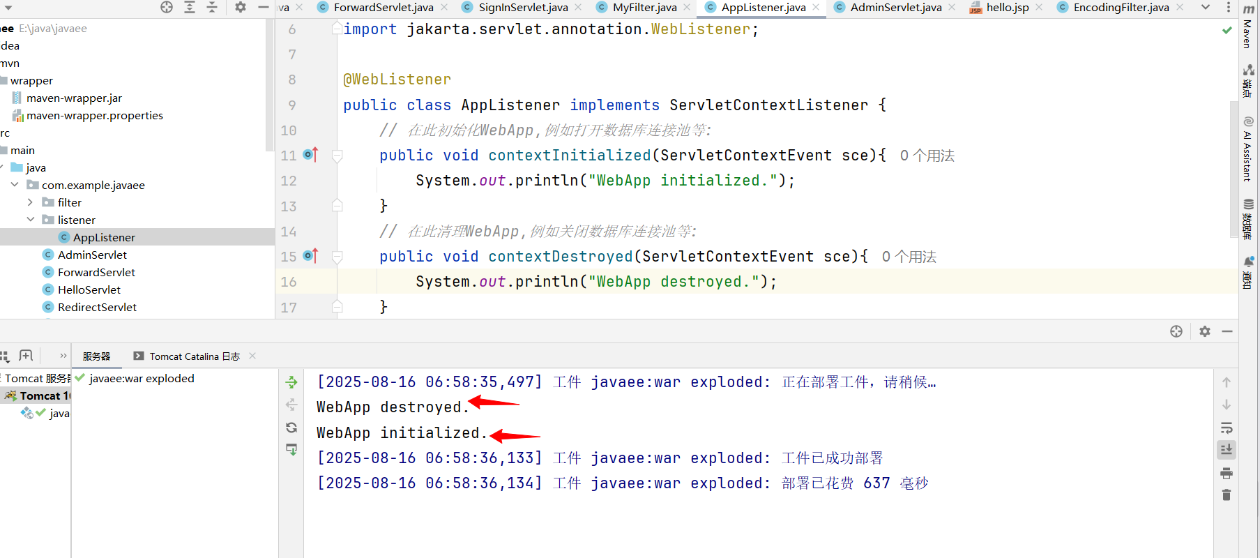 Listener顾名思义就是监听器,有好⼏种Listener,其中最常⽤的是 ServletContextListener,它其实就是去监听程序是否进行初始化or关闭。