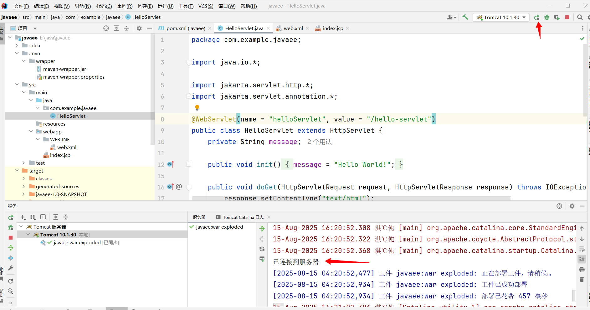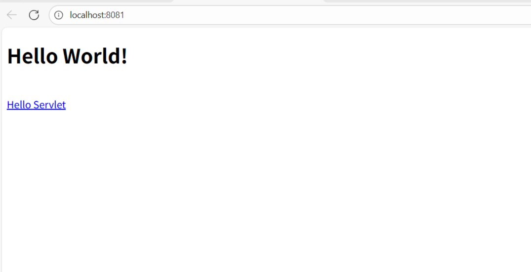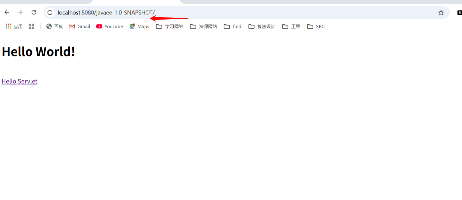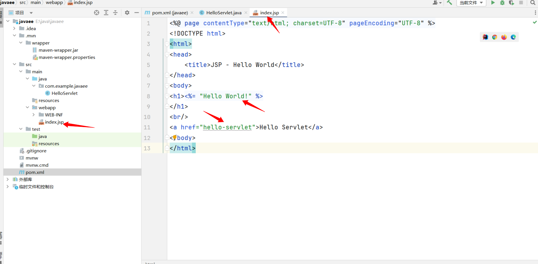 index.jsp是输出Hello World!到前端 同时还插入了一个hello-servlet链接。