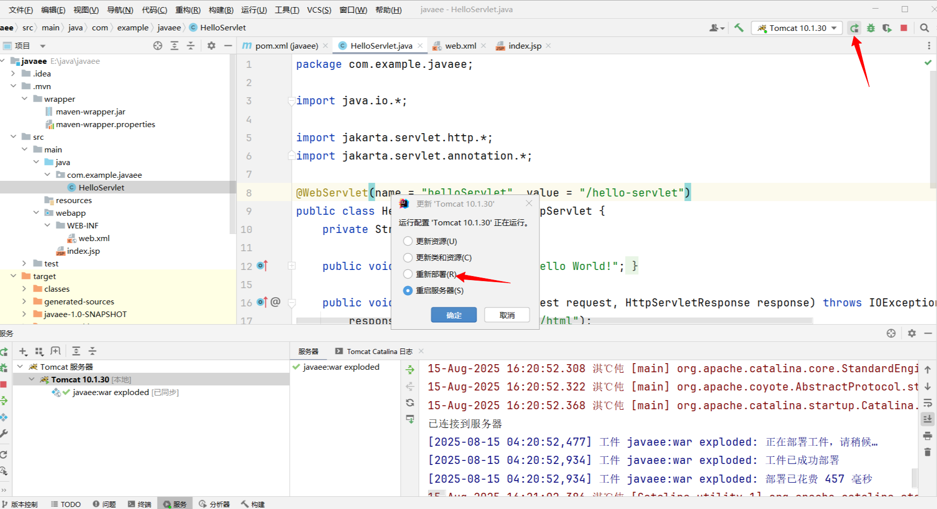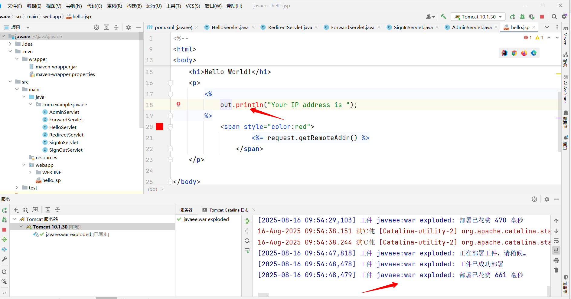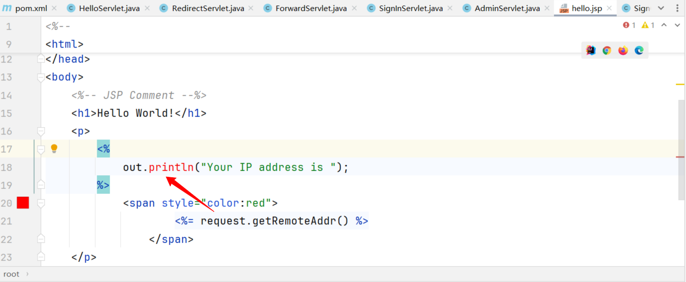 index.jsp是输出Hello World!到前端 同时还插入了一个hello-servlet链接。