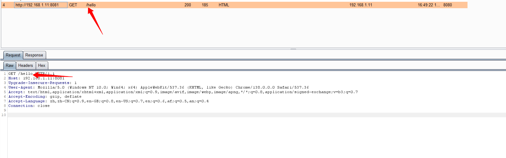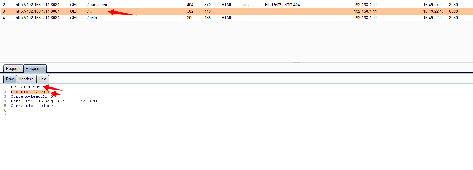 抓包可以看到 当我们访问/hi时 响应包会返回302 重定向到Location: /hello