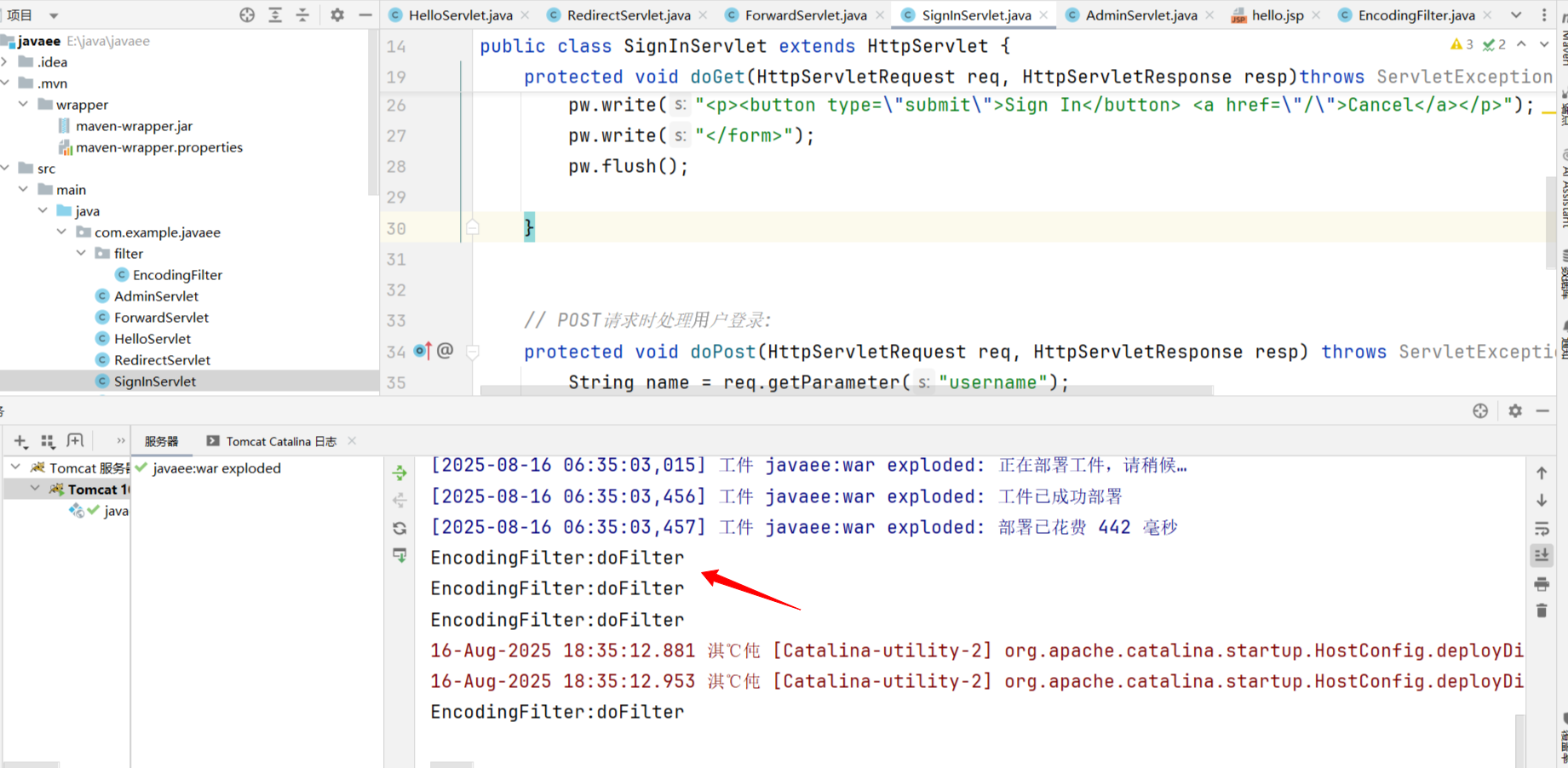 chain.doFilter(request, response); 写完Filter如果要继续处理请求的话 就得要加chain.daFilter 否则到filter这儿就不转发了 到不了Servlet 看到的就是空白页