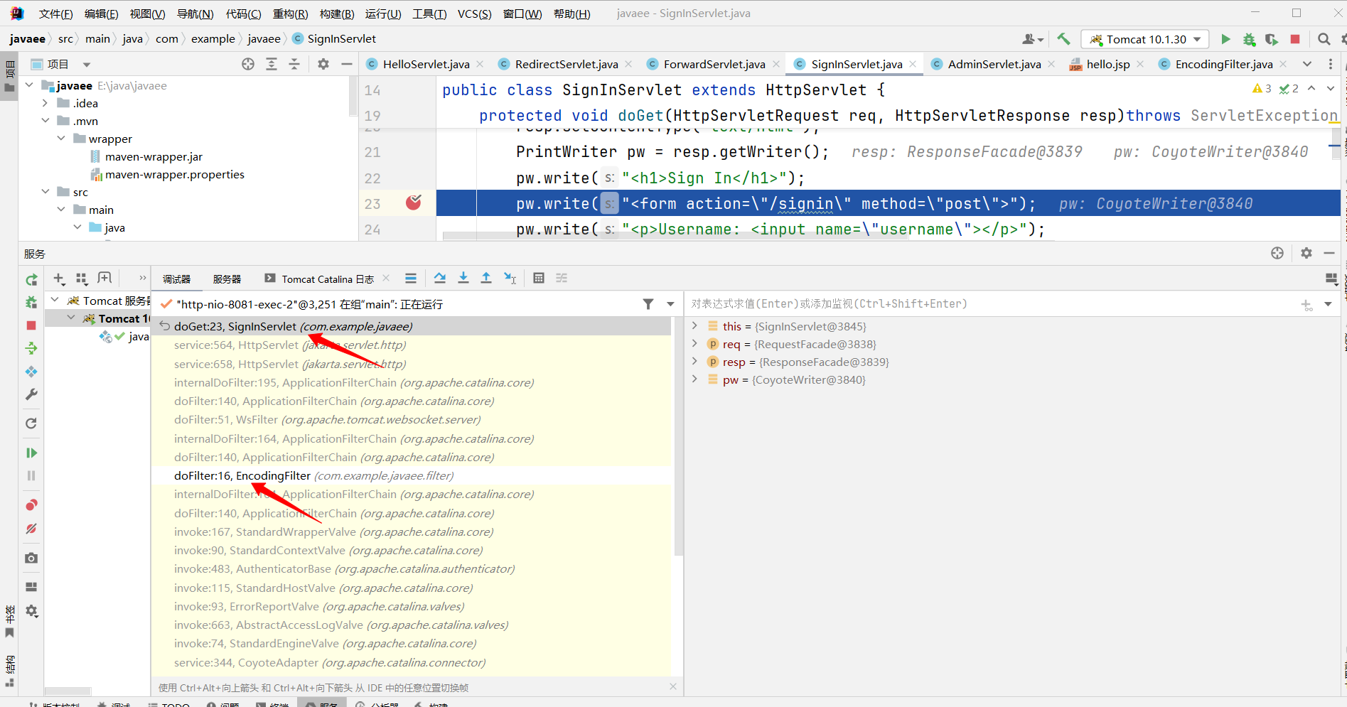 随后客户端发送/hello请求到服务端 访问到了HelloServlet
