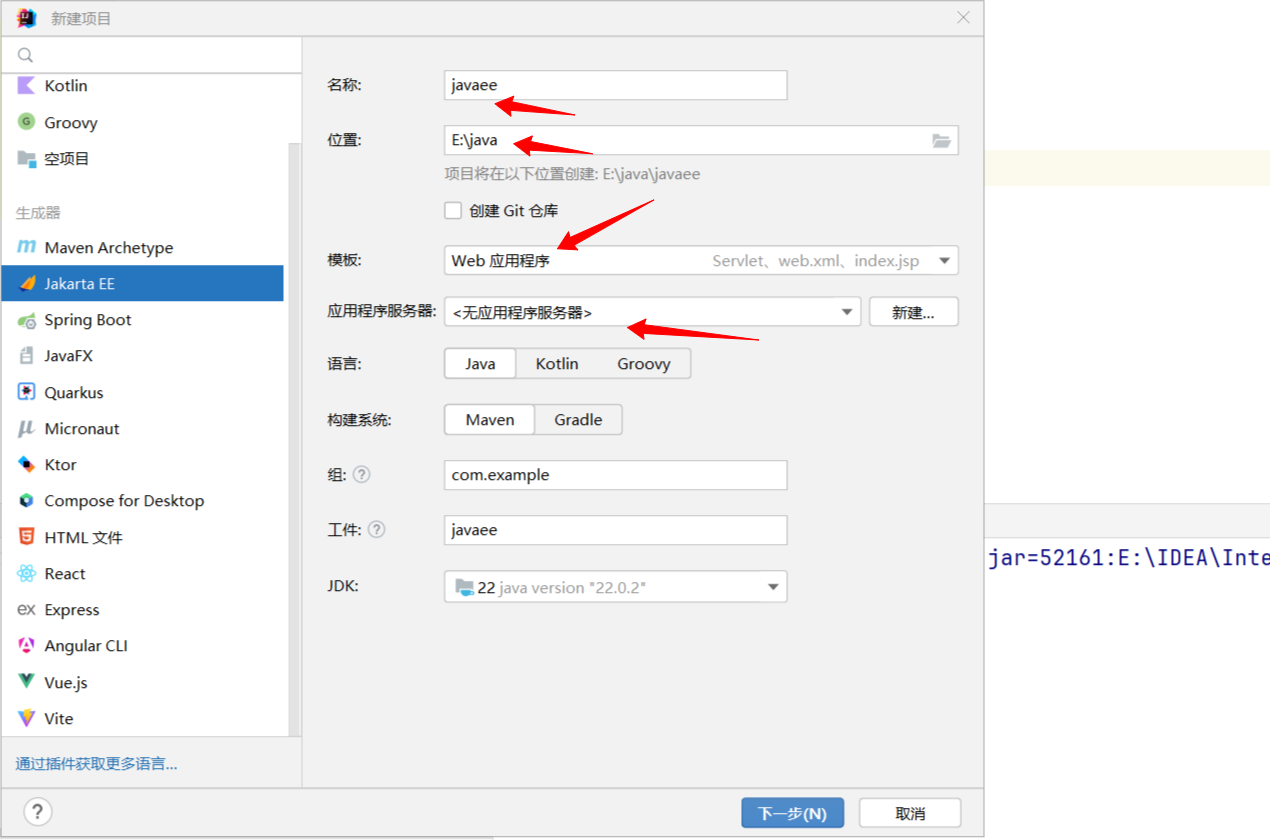 1.新建Jakarta EE项目 应用服务器可以先不选