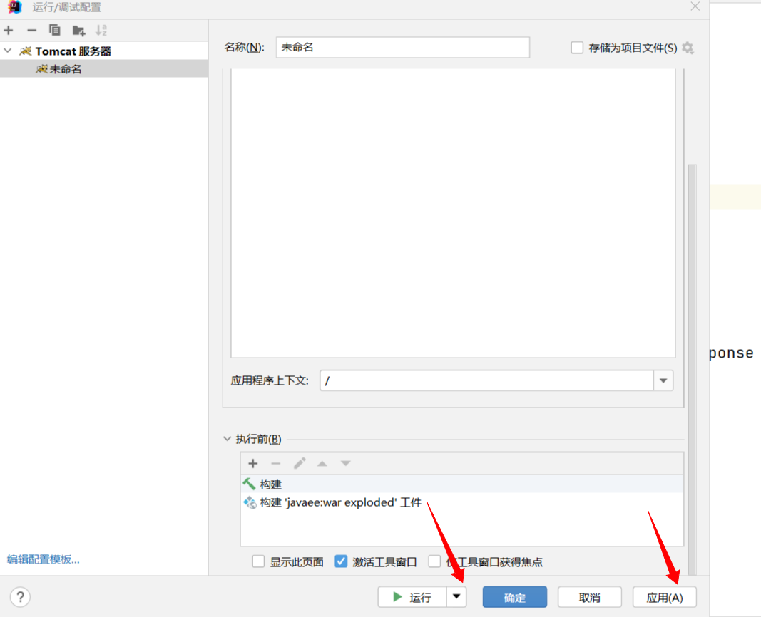 5.设置应用程序上下文 点击应用 确定。(一定要记得这一步,不然访问时就得带着javaee_war_exploded这个url了)