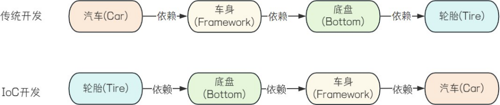 我们尝试换一种思路,我们先设计汽车的大概样子,然后根据汽车的样子来设计车身,根据车身来设计底盘,最后根据底盘来设计轮子。这时候,依赖关系就倒置过来了:轮子依赖底盘,底盘依赖车身,车身依赖汽车