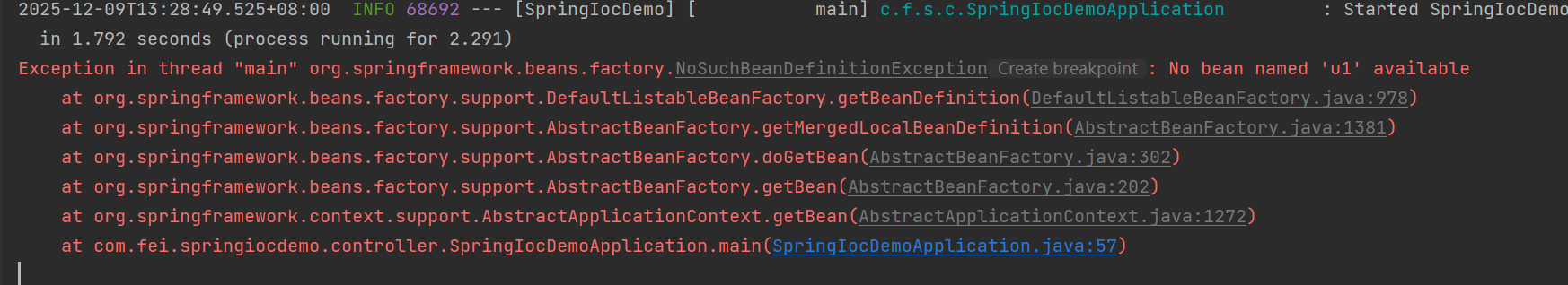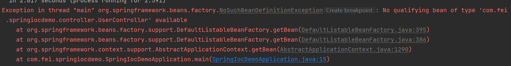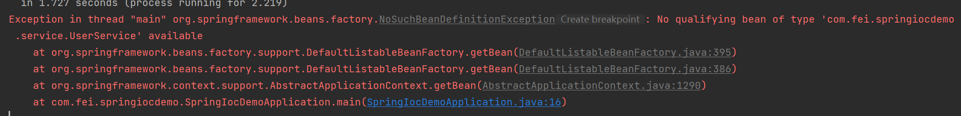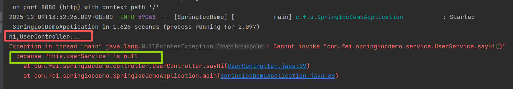 这里,我们去掉UserService的@Autowired注解,再运行程序观察结果: