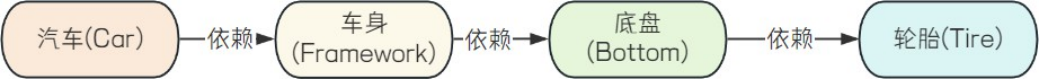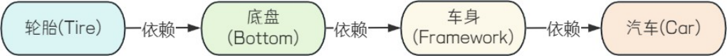 先设计轮子(Tire),然后根据轮子的大小设计底盘(Bottom),接着根据地盘设计车身(Framework),最后根据车身设计好整个汽车(Car)。这里就出现了一个"依赖"关系:汽车依赖车身,车身依赖底盘,底盘依赖轮子