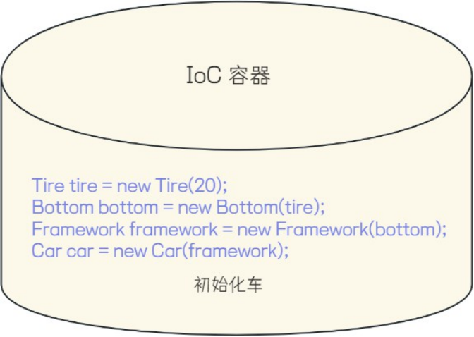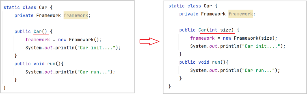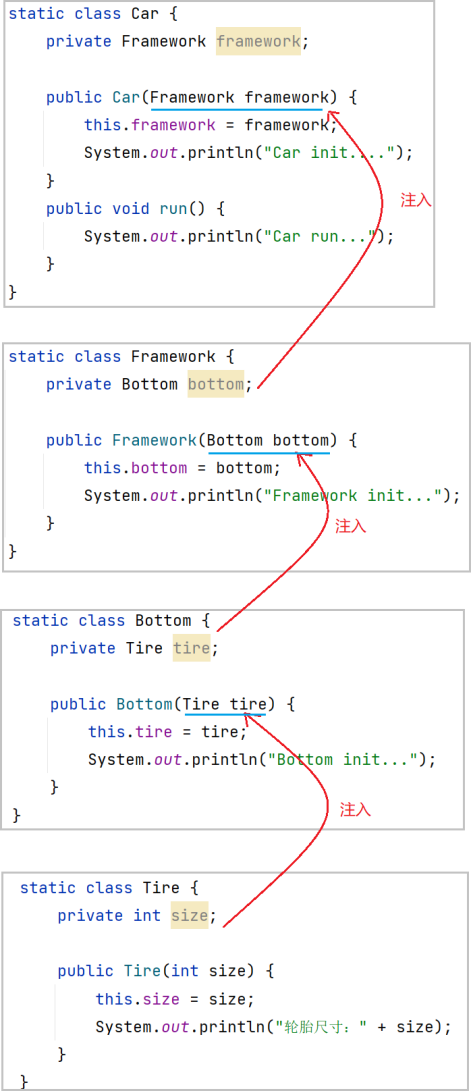 主要原因是,我们在每个类中自己创建下级类,像在Car类中,自己使用new来创建Framework类,在Framework类中,自己创建Bottom类.......,如果自己创建下级类就会出现当下级类发生改变操作,自己也要跟着修改。