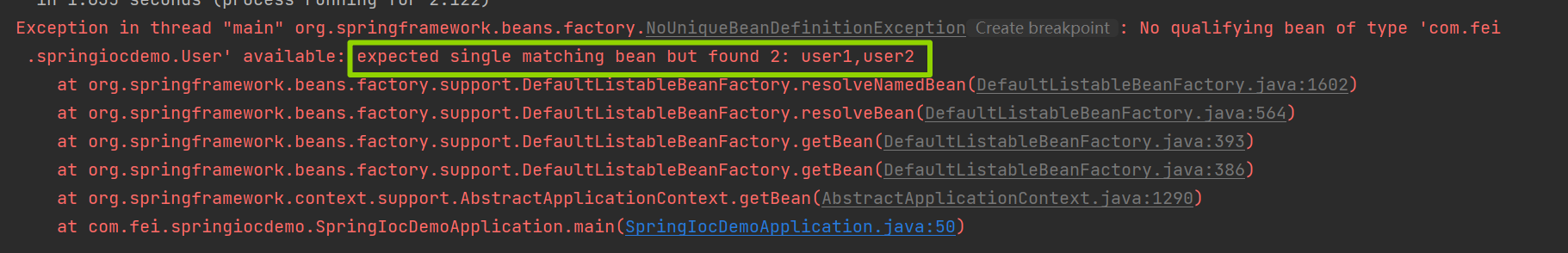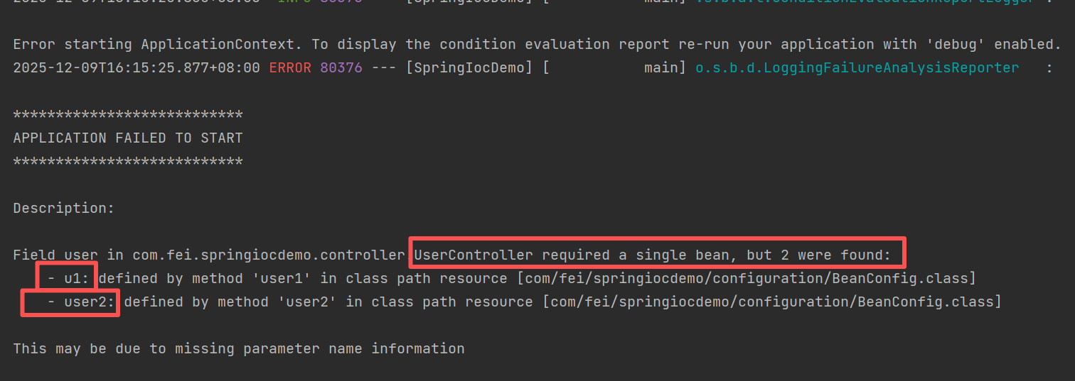 主要是因为在BeanConfig中有两个Bean对象,并且它们的返回类型都为User,而在UserController中需要注入User对象,此时Spring就不知道到底该注入BeanConfig的哪个对象了