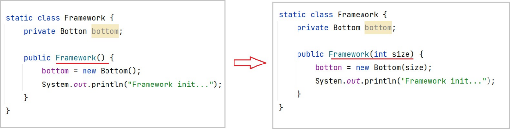 此时,我们只需要将原来由自己创建的下级类,改为传递的方式(也就是注入的方式),因为我们不需要在当前类中创建下级类了,所以下级类即使发生变化(创建或减少参数),当前类本身也无需修改任何代码,这样就完成了程序的解耦。
