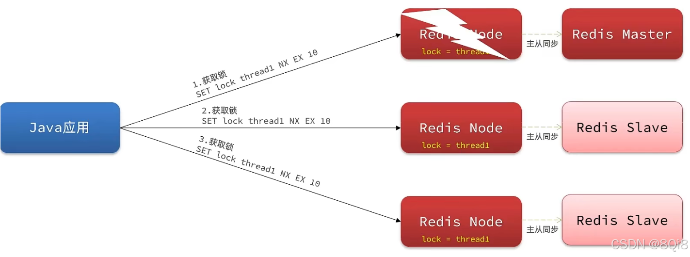 此时我们去写命令,写在主机上, 主机会将数据同步给从机,但是假设在主机还没有来得及把数据写入到从机去的时候,此时主机宕机,哨兵会发现主机宕机,并且选举一个slave变成master,而此时新的master中实际上并没有锁信息,此时锁信息就已经丢掉了。