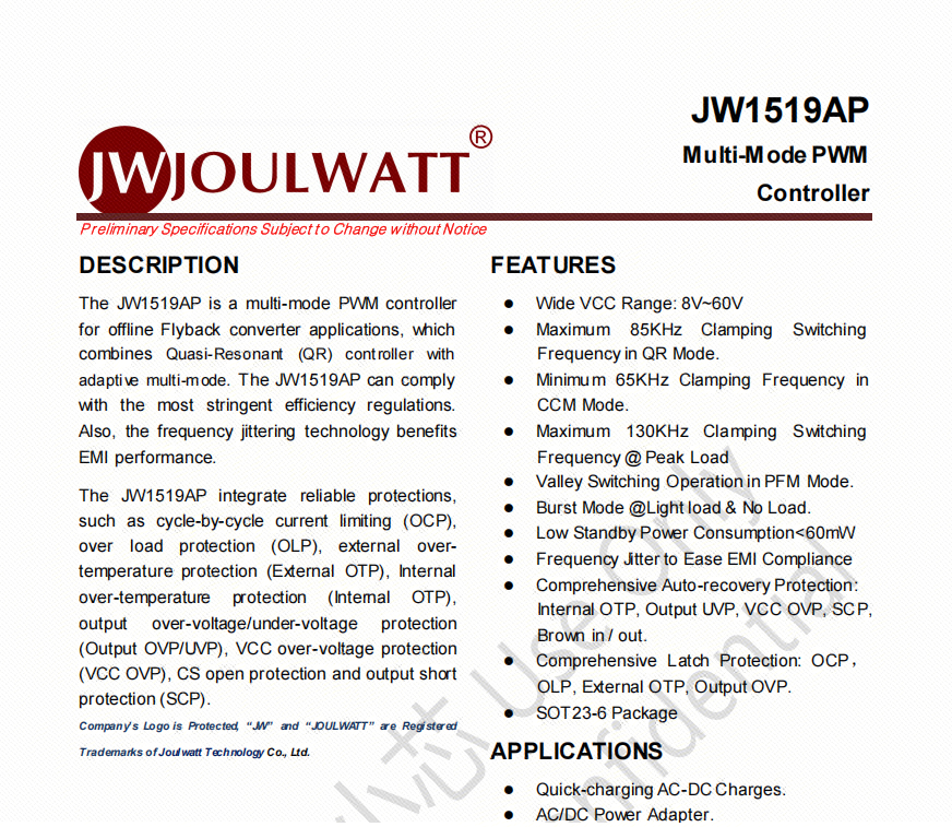 核心优势:多模式自适应运行、内置EMI优化机制、保护功能完善,外围电路简洁,降低电源设计门槛。