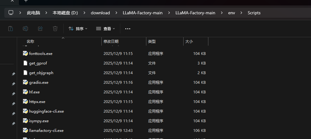 之后可以在env\Scripts下看到一个llamafactory-cli.exe执行文件