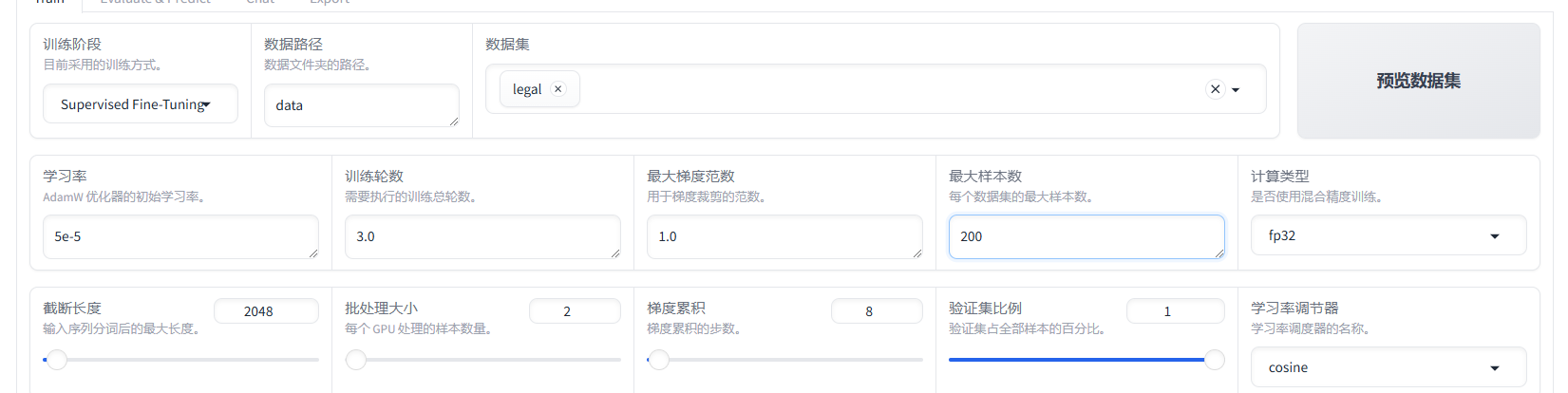 配置微调参数,计算类型选择fp32,是因为我的电脑没有GPU,最大样本设置200,调试阶段不需要用太多