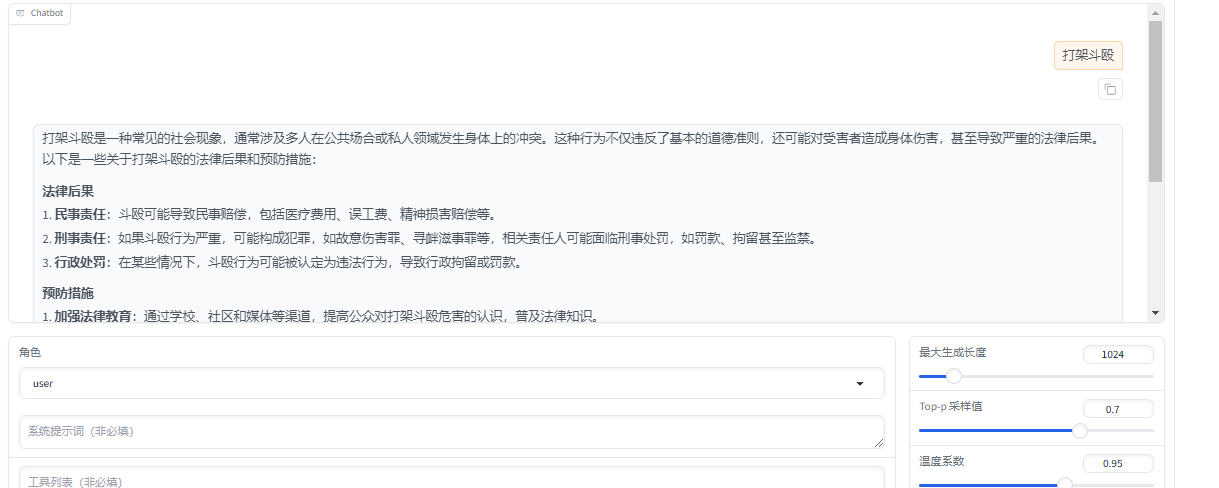就可以进行测试,因为我用的模型,法律推理/判决预测(Legal Judgment Prediction)任务 的结构化样本,所以输出的内容是这样的