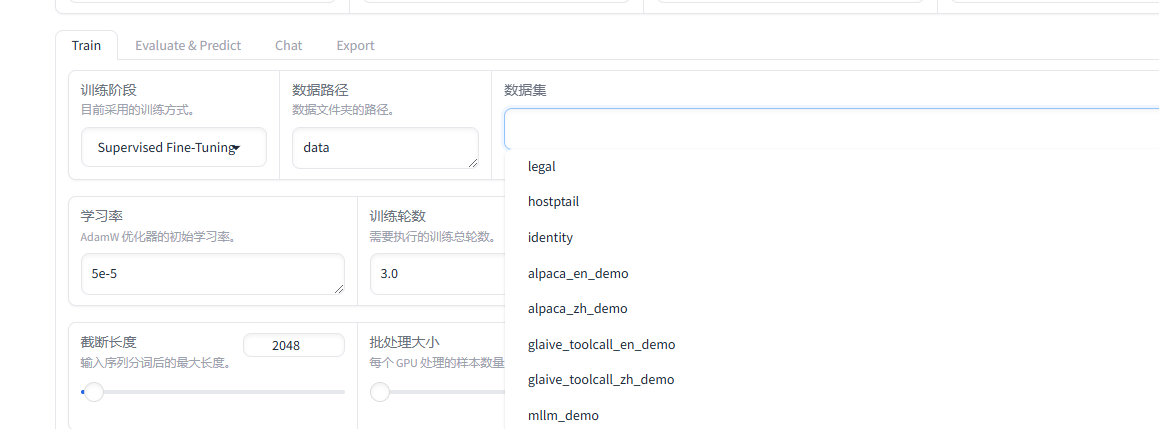 整数 | 1024 | 512 ~ 4096 | 输入序列分词后的最大长度 | - 2048表示文本会被截断或填充到2048个token - 影响: - 长文本任务需要设置较大值 - 值越大显存占用越高 - 超过模型最大长度会出错 |