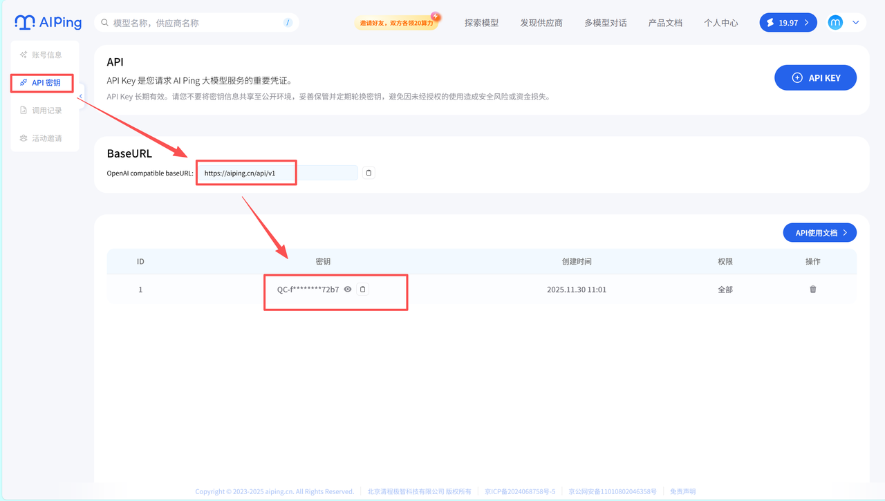 3. 获取API密钥 :首先,需要在AI Ping平台注册账号并创建API Key。来到我的个人中心,然后"API密钥"页面生成一个新的密钥,并妥善保存。通过AI Ping平台上面的活动免费领算力,对于个人开发者而言通常足够使用。