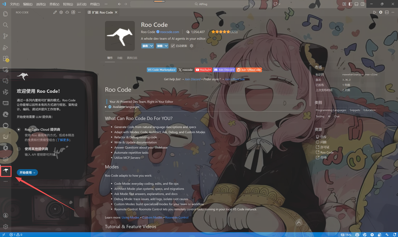 安装完成后,VSCode左侧活动栏将出现一个新的Roo Code图标(通常是一个小火箭图标),表示插件已成功集成。点击该图标即可打开Roo Code的面板,开始使用其AI编程功能。
