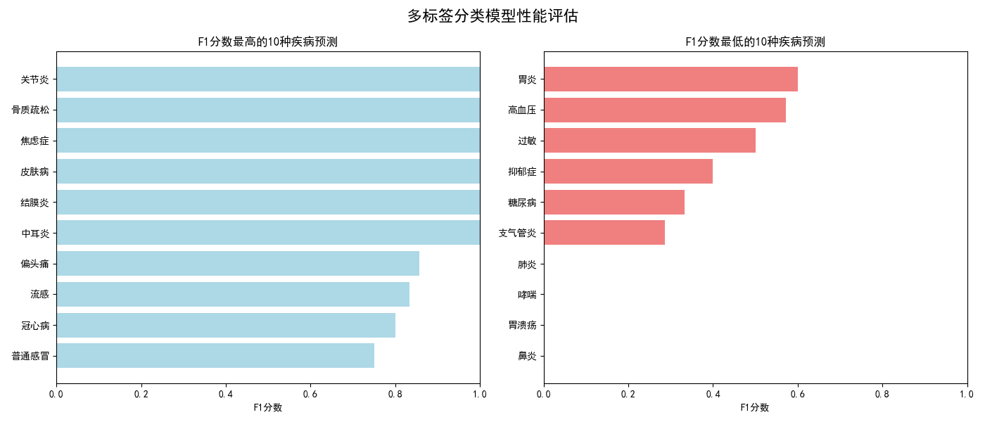 分析:水平条形图显示了模型难以准确识别的疾病,F1分数较低。浅珊瑚色调表示需要改进的领域。通过对比左右两图,学生可以理解模型的优势和局限性。