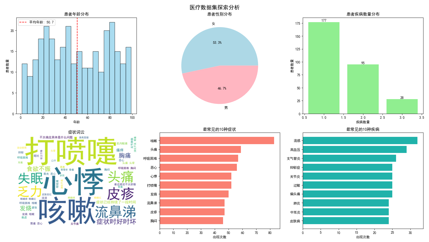 分析:饼图直观显示了男女患者比例,使用浅蓝色和浅粉色区分。在真实的医疗系统中,性别通常是影响疾病发生的重要因素。