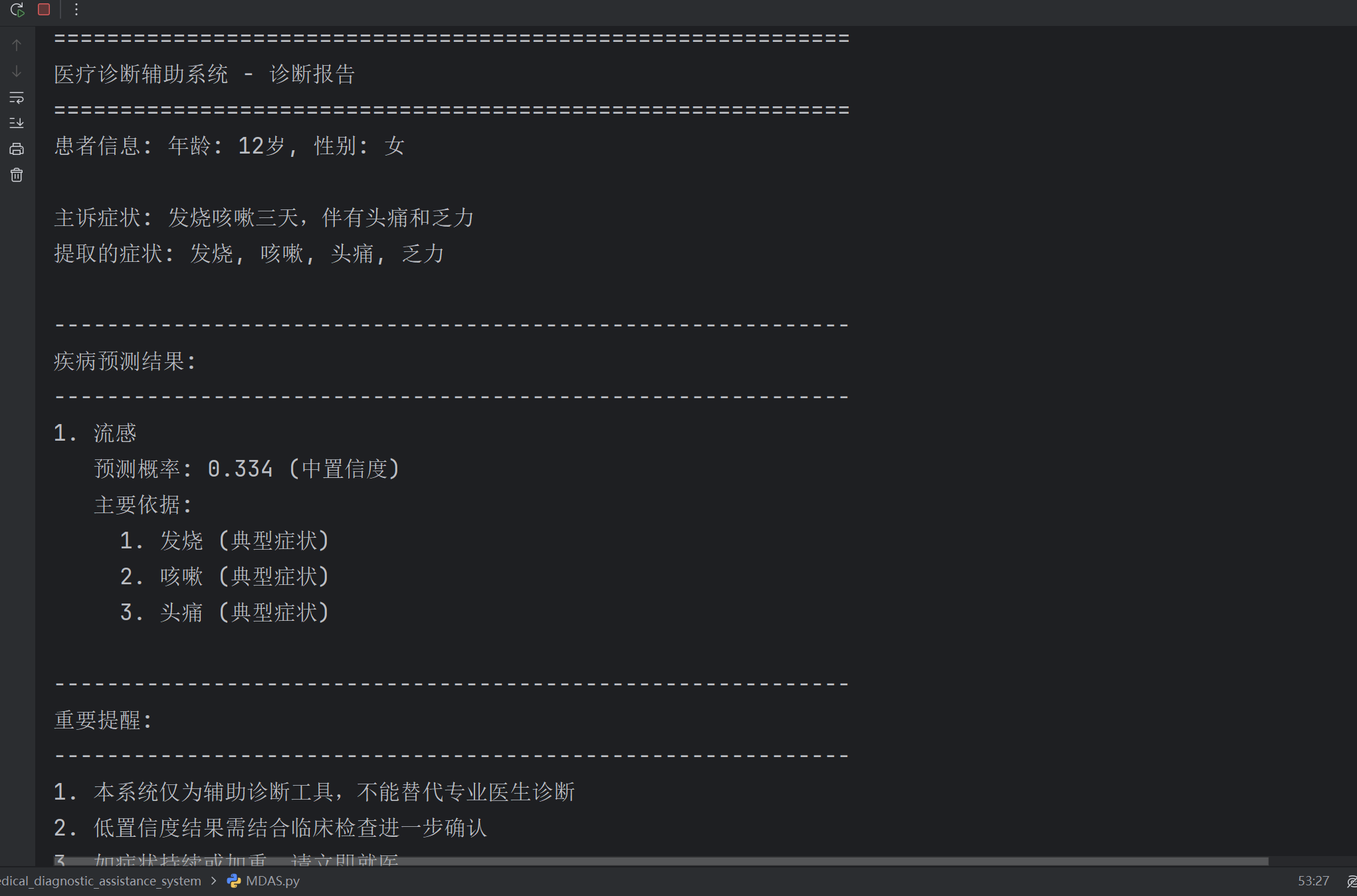 分析:水平条形图区分了"典型症状"(浅蓝色)和"一般症状"(浅灰色)。这个图增强了模型的可解释性,帮助用户理解为什么系统做出特定预测,也体现了朴素贝叶斯算法的原理------基于症状出现的概率计算疾病可能性。