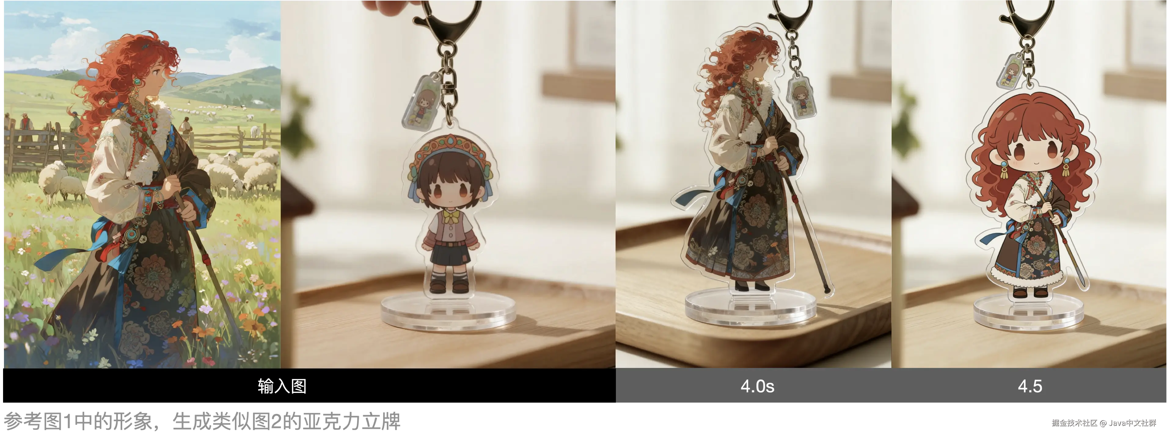 看对比图就能发现,4.0 版本容易出现人物混淆、脸部变形;而 4.5 生成的图片,不仅和原图保持了极高的一致性,自带的美颜美体效果也更自然了。