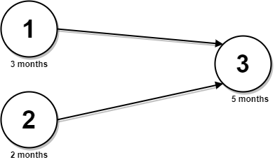 输入:n = 3, relations = [[1,3],[2,3]], time = [3,2,5]