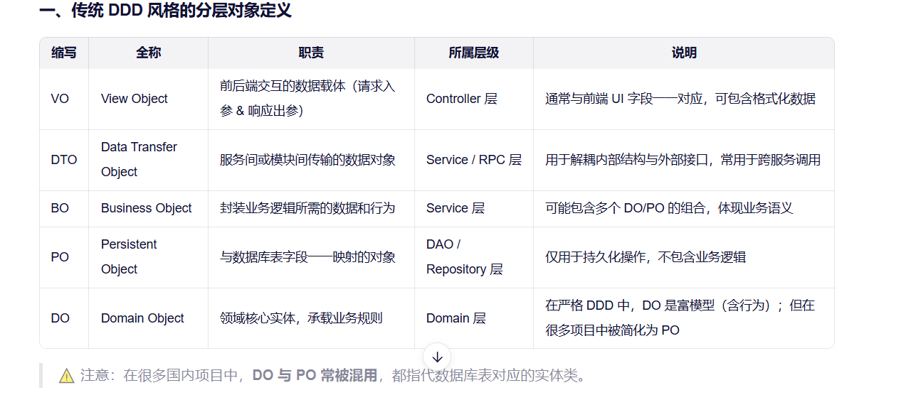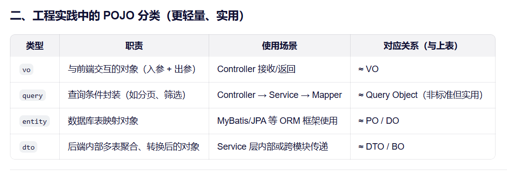 一种是基于 DDD(领域驱动设计) 的术语体(VO/DTO/BO/PO/DO),另一种是更偏向 工程实践中的 POJO 分类(vo/query/entity/dto)。