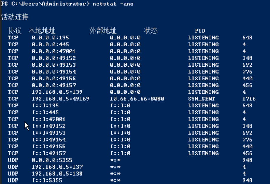PID为 1716,外部连接地址为10.66.66.66:8080
