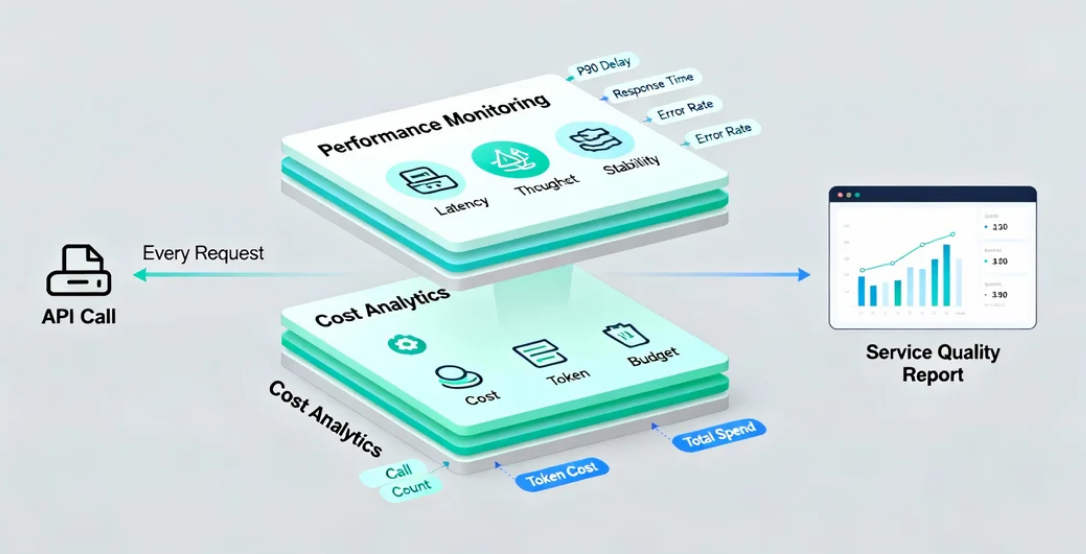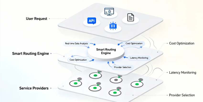 - 智能路由平台通过统一API接口整合多模型服务,基于实时监控数据(价格/P90延迟/吞吐量)自动匹配最优供应商,实时监测节点健康并自动切换保障高可用,提供调用数据支撑成本优化决策,实现API调用的稳定、高效与低成本。