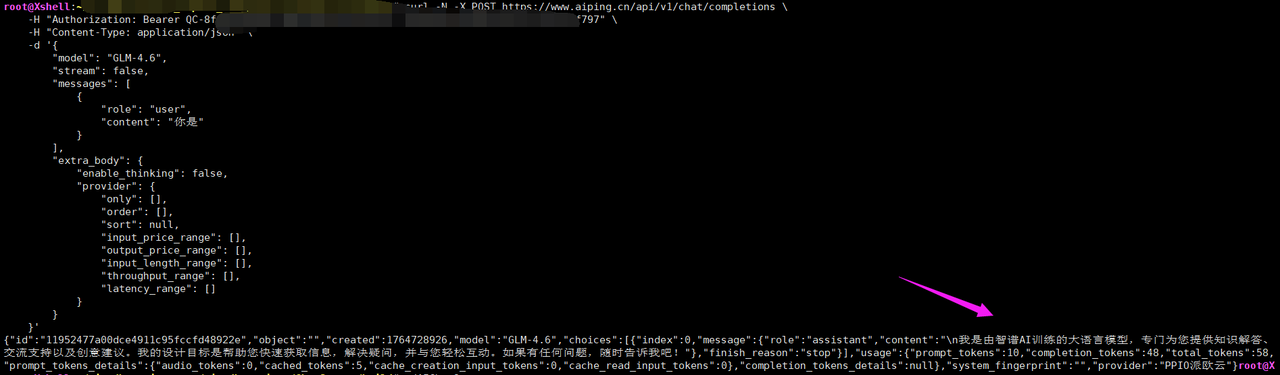 -d '{"model": "GLM-4.6","stream": true,"messages": [{"role": "user","content": "Hello"}],"extra_body": {"enable_thinking": false,"provider": {"only": [],