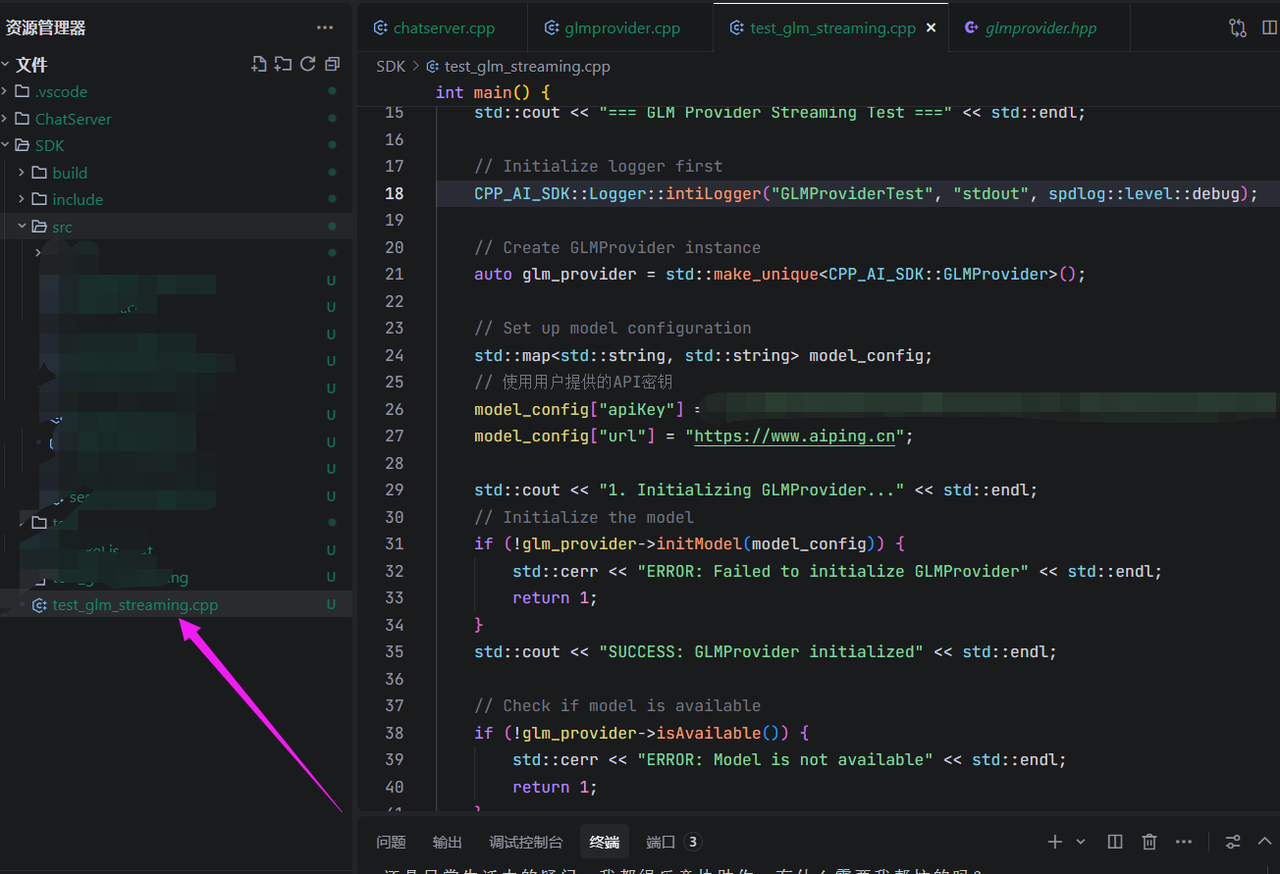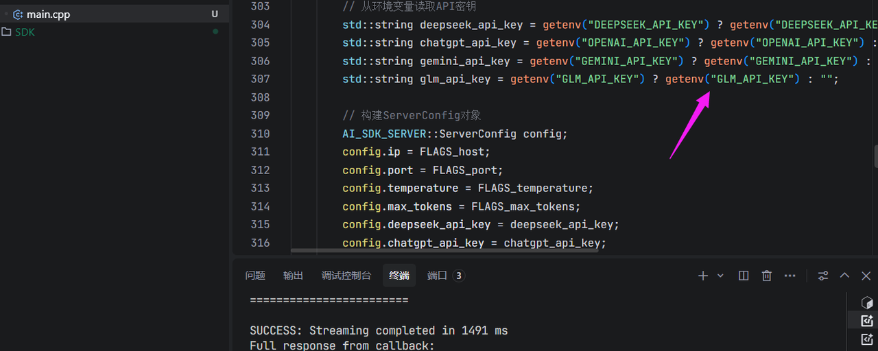 最后生成的这个main.cpp看起来还不错,提供了对应说明,配置文件加载等功能,当然还有我们之前说的从环境变量中获取apikey功能也加进来了: