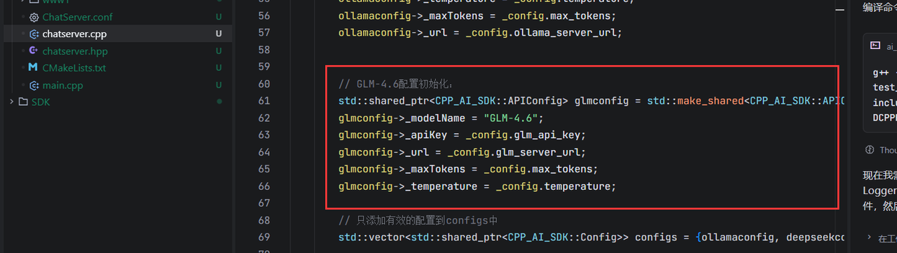 - 主要的是这里不能出问题,根据外部传来的配置参数,必须把对应的glmconfig初始化好,不然内部调用对应的AI Ping平台获取对应应答就会出错,所以一定要仔细检查。