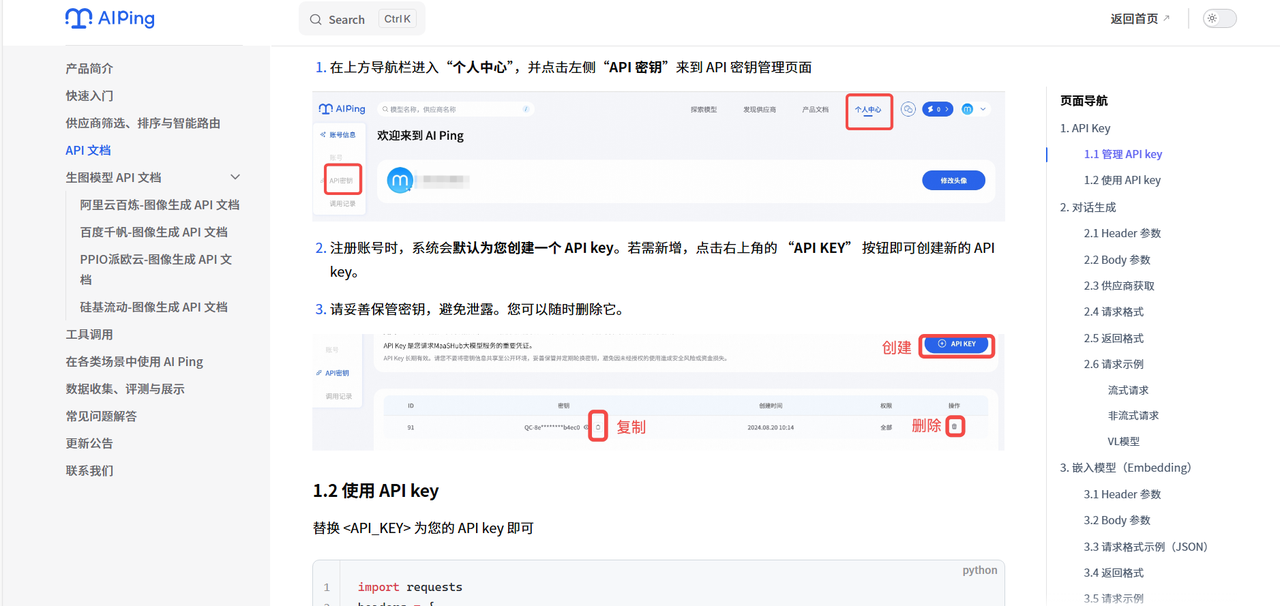 - 首先来到个人中心,我们进行对应的api密钥创建,这个也就是我们通过AI Ping 平台这个中转站去调用其他模型官方API平台的凭证。